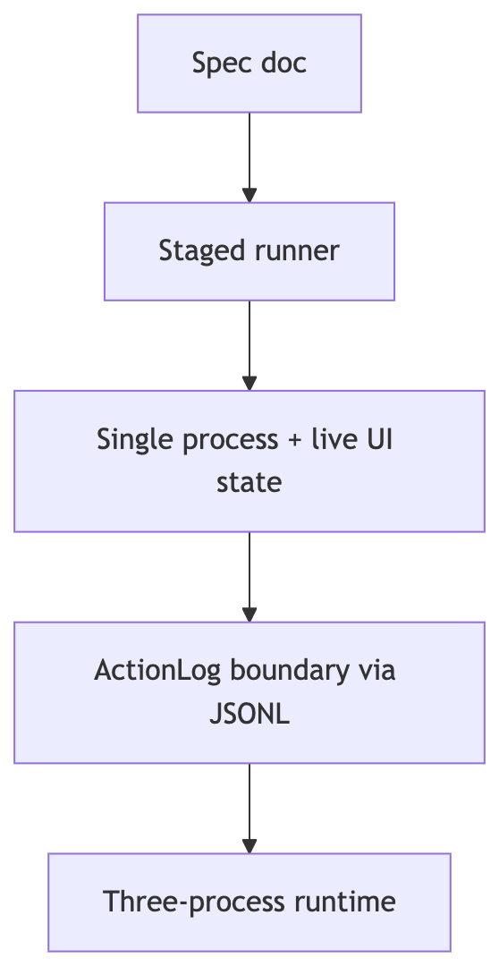 But once your journal hardens into an interface contract, the UI stops co-owning state. It becomes a reader. And once orchestration splits cleanly from execution, you’re no longer decorating a command-line script.