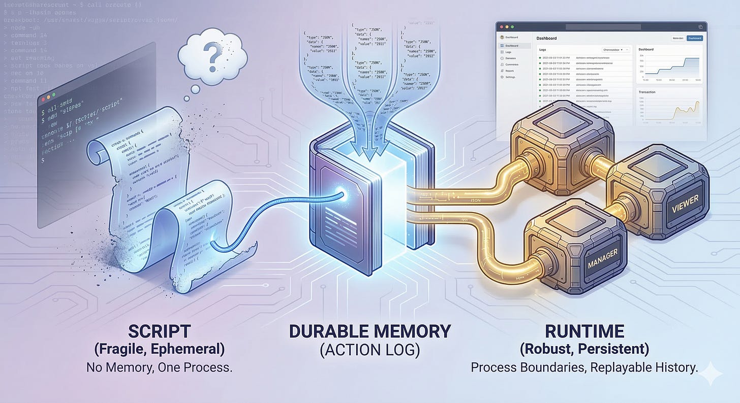Writing that journal felt heavier up front than throwing strings at a terminal. But it bought me replayability, headless operation, and clean ownership. My important state was no longer trapped inside my execution loop. It was a durable, tail-able history.