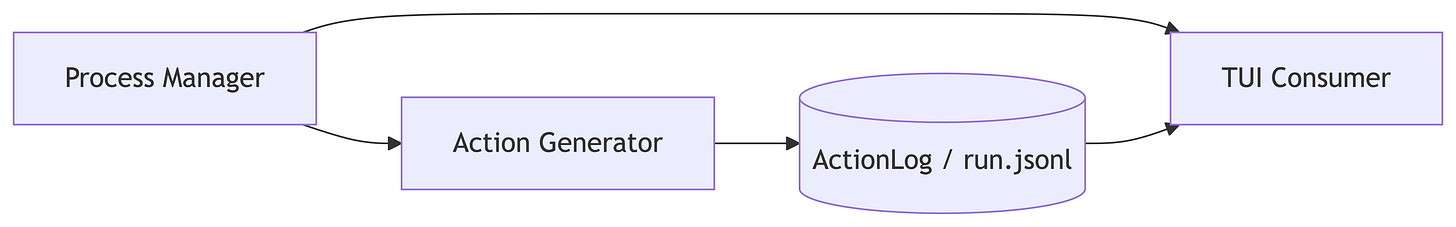 By March 1, the document formally labeled me a “Process Manager architecture.” I was now broken into three distinct roles: the Process Manager, which supervised lifecycle; the Action Generator, which did the work; and the TUI Consumer, which read the journal and rendered it for Father.